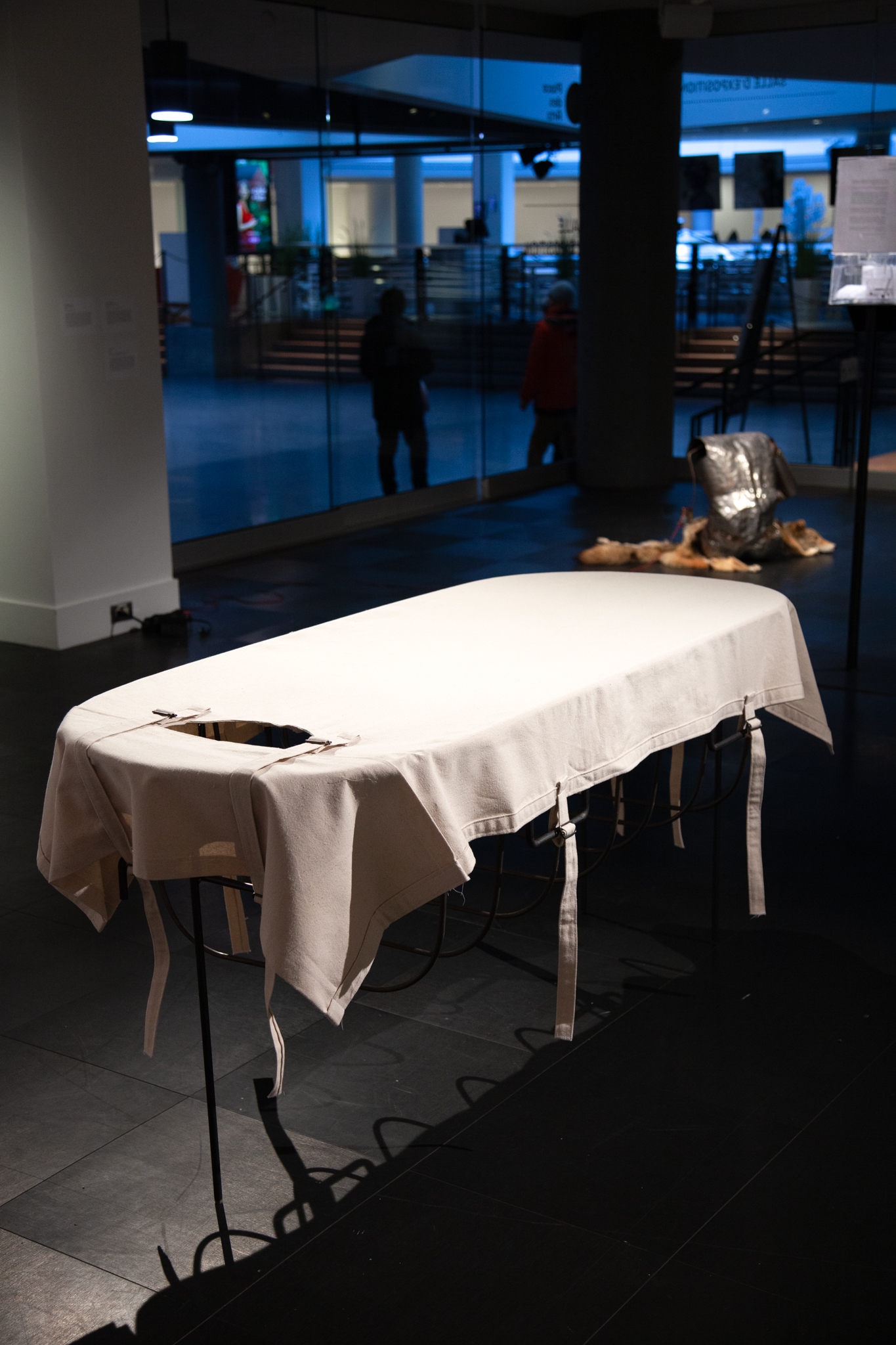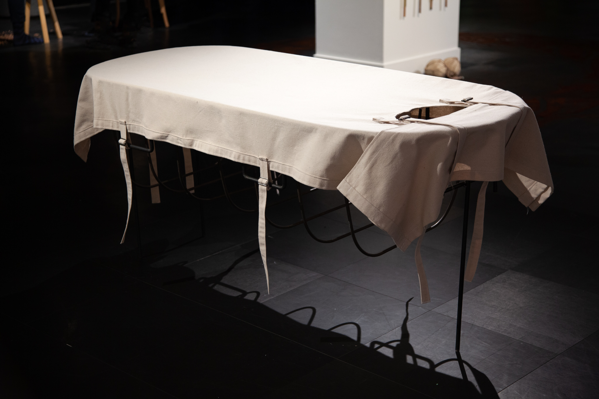 Peau est une œuvre découlant de recherches sur les traitements et méthodes mis en place par les instituts psychiatriques de pays occidentaux dès la fin du XIXe siècle. Fondé sur un symbole historique de contention, l’objet représenté est à la fois imaginé comme une interprétation contemporaine des valeurs actuelles en matière de santé mentale. Il met en question la façon dont nous abordons les maladies intangibles du corps-esprit et il soulève l’inconfortable incompréhension qui nous habite encore en ce début de XXIe siècle. Le textile, qui habituellement habille le corps, représente ici plutôt un outil pour le comprimer, le limiter et le contraindre. La contention devient ainsi une deuxième peau, imposée par les pratiques institutionnelles de l’époque et par la maladie elle-même.