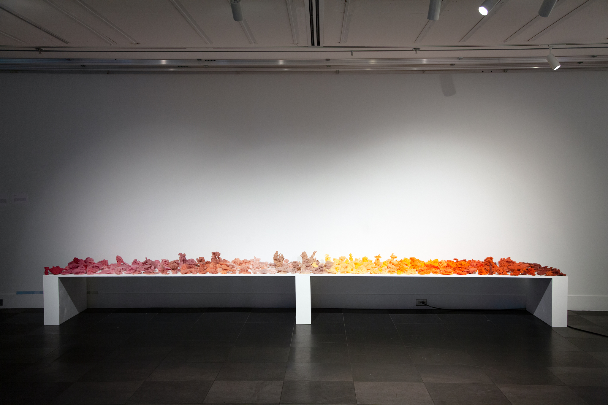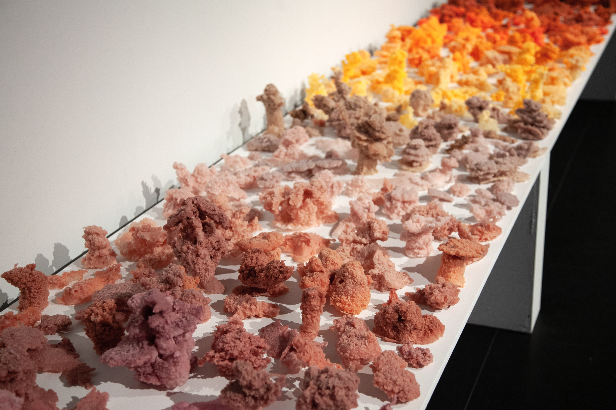Ma démarche cherche à s’éloigner d’une pratique purement conceptuelle pour tendre vers quelque chose de plus instinctif et de plus hasardeux. Pour Gelé.e.s, je détermine les paramètres extérieurs – la couleur et la quantité de cire – sans pour autant pouvoir prédéterminer le résultat. L’absence de contrôle sur ce qui se passe lorsque la cire entre en contact avec la matière offre une opportunité d’explorer la synthèse paradoxale de la méthode et du lâcher-prise. Chaque coulée est une surprise. Dans un monde idéal, les formes envahiraient la pièce au complet, murs et sol en seraient recouverts.